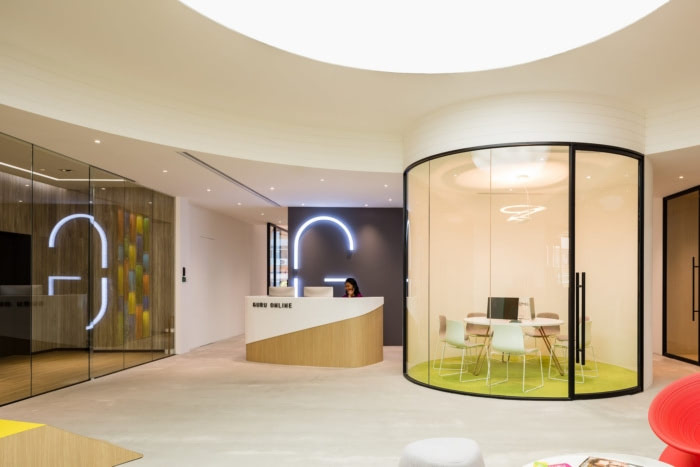 2、流动线条牵渡空间光感:巧置在休憩区隔间墙后的办公空间,是员工们激发灵感、探究创意思维的原点,为使功能更宏观、效能更卓越,因此在座区规划上则以尺度较为宽敞的办公桌为物件规格,同时为避免天花所生成的压迫视野,保留了建筑体的裸露结构,并运用白色钢管结合LED灯设计,以330公分的合宜高度设计,作为照明空间的最适亮感,也成为空间的意外惊喜,宛若活动频率般的起伏线条,是空间辅助光源的藏灯设计,流窜在办公区的座位间,手法独特且引人好奇,用线条的存在,既反映了空间的延伸向度,在建构完整的穿透张力同时,也演绎出室内设计办公室里的有机生命力。